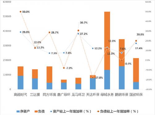 從資產(chǎn)和負債的變化來看,總資產(chǎn)增長率高于負債增長率的企業(yè)有三家,分別為天達環(huán)保、鵬鷂環(huán)保及鑫廣綠環(huán)。而負債增加率明顯高于總資產(chǎn)增加率的企業(yè)為高能時代和同方環(huán)境,其余企業(yè)二者相當。