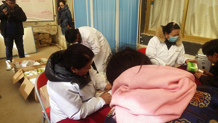 義診活動在下午三點半開始,前來就診咨詢的群眾絡(luò)繹不絕。醫(yī)務(wù)人員在為患病群眾把脈號診、開處方的同時,結(jié)合那曲縣羅瑪鎮(zhèn)群眾常見病、多發(fā)病及高海拔地區(qū)的氣候特點,給當?shù)厝罕娞岢隽巳粘I铒嬍辰ㄗh,在疾病預(yù)防、降低常見病發(fā)病率方面提供生活指南。義診期間,醫(yī)療服務(wù)小分隊醫(yī)務(wù)人員加班加點,共為羅瑪鎮(zhèn)的400余名群眾進行了義診檢查,發(fā)放藥品價值2萬余元,在為患病群眾解除病癥、減輕病痛的同時,切實溫暖了廣大群眾的心。