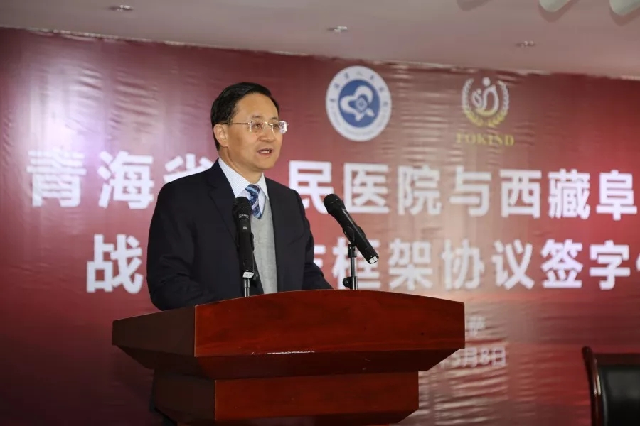 西藏自治區(qū)政協(xié)副主席、區(qū)工商聯(lián)主席阿沛·晉源代表自治區(qū)工商聯(lián)對青海省人民醫(yī)院和上海瑞金醫(yī)院各位專家的到來表示熱烈歡迎,為青海省人民醫(yī)院和西藏阜康醫(yī)院戰(zhàn)略合作簽約以及西藏阜康醫(yī)院高原健康研究中心正式成立表示熱烈祝賀。