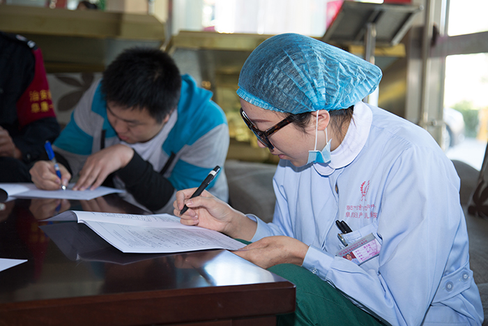 參加獻(xiàn)血的醫(yī)務(wù)人員填寫(xiě)表格