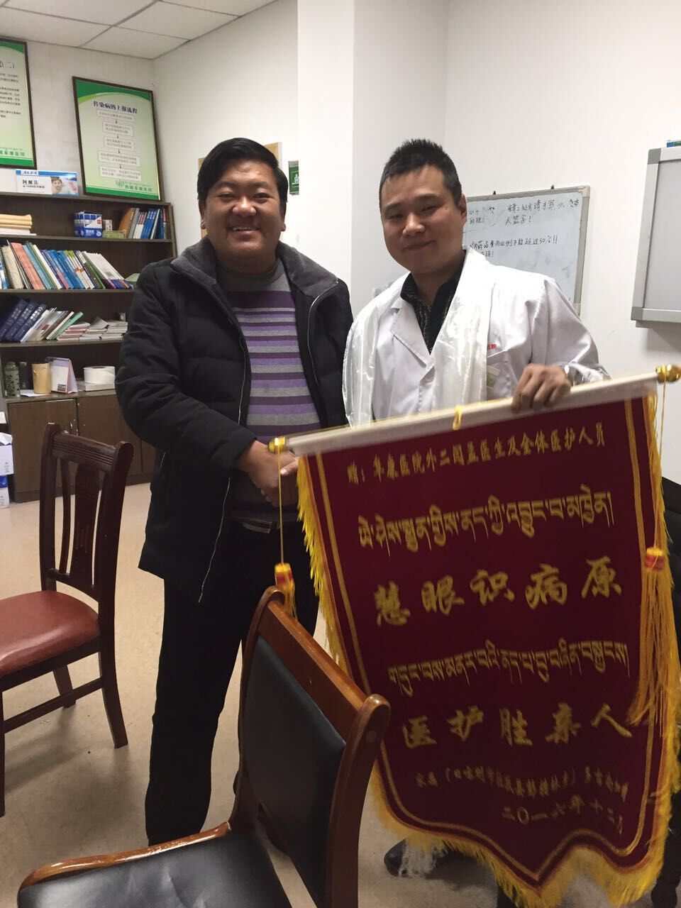 近日,西藏阜康醫(yī)院外二科病區(qū)上演了溫馨的一幕,患者曲宗(化名)家屬手捧一面寫(xiě)著“ 慧眼識(shí)病原,醫(yī)護(hù)勝親人”字樣的錦旗,再三感謝我科閆孟醫(yī)生及科室全體醫(yī)護(hù)人員對(duì)他的精心治療和護(hù)理,連連稱贊醫(yī)護(hù)人員醫(yī)術(shù)精湛,不是親人勝似親人。