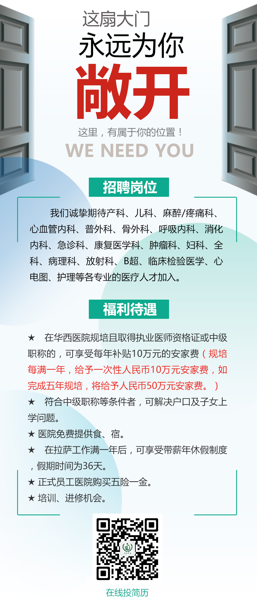 西藏阜康醫(yī)院面向社會(huì)公開(kāi)招聘產(chǎn)科、兒科、麻醉/疼痛科、心血管內(nèi)科、普外科、骨科、呼吸內(nèi)科、消化內(nèi)科、急診科、康復(fù)醫(yī)學(xué)科、婦科、全科、病理科、放射科、B超、臨床檢驗(yàn)、心電圖等各專(zhuān)業(yè)的醫(yī)療人才。對(duì)于在華西醫(yī)院完成住院醫(yī)師規(guī)范化培訓(xùn)且取得執(zhí)業(yè)醫(yī)師資格證或中級(jí)職稱(chēng)的醫(yī)師,一經(jīng)錄用,按參加規(guī)培年限每年10萬(wàn)給付安家費(fèi)(完成3年規(guī)培,給予30萬(wàn)安家費(fèi);完成5年規(guī)培,提供安家費(fèi)的規(guī)培醫(yī)師必須簽訂合同在阜康服務(wù)六年,否則按差額服務(wù)年限退回相應(yīng)的安家費(fèi)),工資獎(jiǎng)金另算。望廣大醫(yī)療人才踴躍投遞簡(jiǎn)歷,為祖國(guó)西部醫(yī)療事業(yè)貢獻(xiàn)力量。
