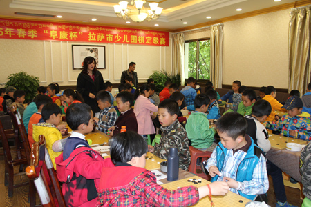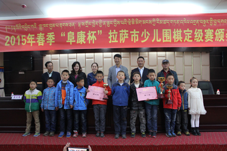 3月25日比賽結(jié)束后“復(fù)康杯”少兒圍棋定級賽頒獎儀式開始,拉薩棋院院長王斌、西藏阜康醫(yī)藥發(fā)展有限公司總經(jīng)理劉瀟瀟、西藏阜康醫(yī)藥發(fā)展有限公司總經(jīng)理陳彬、拉薩棋院圍棋部副主任趙鈞以及棋院老師陳學(xué)滸、袁文琴出席了本次會議。 王斌院長在頒獎儀式表示,很高興能夠舉辦拉薩市首屆“阜康杯”少兒圍棋定級賽,他向比賽獲勝者表示衷心的祝賀,希望他們能再接再厲繼續(xù)學(xué)習(xí)圍棋。他了解到很多家長對拉薩市棋院選址郵政賓館非常滿意,這里環(huán)境清幽,非常適合教學(xué),他當(dāng)場表示郵政賓館二樓已經(jīng)被棋院斥資180萬元租賃6年,至少在6年以內(nèi)棋院不會從新選址。王斌表示,目前,拉薩棋院正在向上級有關(guān)部門申請圍棋段位資格證的相關(guān)事宜,如無意外,預(yù)計(jì)在今年年底能夠申請成功,完成圍棋段位資格證的申請,不僅能給我區(qū)圍棋事業(yè)的發(fā)展帶來很大的幫助同時也能讓我區(qū)更多的圍棋愛好者參與到此次項(xiàng)目。