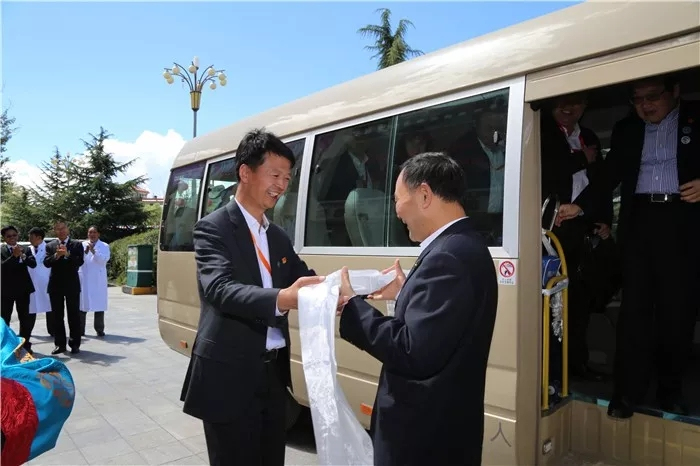 西藏阜康醫(yī)療股份有限公司黨委書記、董事長王斌同志為蒞臨阜康醫(yī)院考察指導的領(lǐng)導獻上哈達