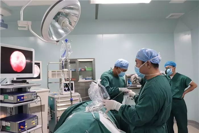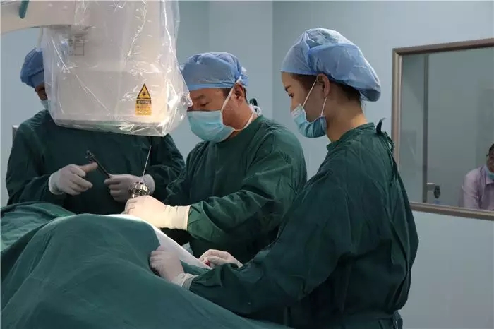 13:00時,徐鑫一行來到病房,對即將接受手術(shù)的患者進(jìn)行術(shù)前評估,看過核磁共振和CT檢查資料,通過交流討論最終確定了手術(shù)方案。13:35分患者被推進(jìn)手術(shù)室,本次手術(shù)由徐鑫和阜康醫(yī)院骨科醫(yī)師李延軍共同完成。手術(shù)運用BEIS技術(shù),在定位階段專家們多次透視確保儀器直達(dá)患處,以確保摘除髓核準(zhǔn)確無誤、減少患者創(chuàng)傷。髓核摘除后,患者疼痛麻木感隨即消失,手術(shù)圓滿成功,16:25分患者被推出手術(shù)室,專家嚴(yán)謹(jǐn)細(xì)致的作風(fēng)以及精湛的技術(shù)贏得醫(yī)務(wù)人員的掌聲。椎間孔鏡微創(chuàng)手術(shù)的重點在于透視定位,只有精準(zhǔn)定位才能保證準(zhǔn)確摘除髓核,減少患者疼痛與創(chuàng)傷。