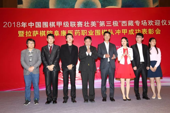 10月7日,2018年中國圍棋甲級聯(lián)賽壯美“第三極”西藏專場歡迎儀式暨拉薩棋院阜康醫(yī)藥職業(yè)圍棋隊沖甲成功表彰會在香格里拉大酒店隆重舉行。西藏自治區(qū)黨委副書記、政府主席齊扎拉,中國圍棋協(xié)會主席林建超,區(qū)政府副主席甲熱·洛桑旦增,國家體育總局棋牌運(yùn)動管理中心黨委書記、主任、中國棋院院長朱國平,中國棋院圍棋部部長王誼,西藏自治區(qū)體育局黨組書記劉伯清、局長尼瑪次仁,拉薩市委常委、常務(wù)副市長占堆,自治區(qū)高級人民法院副院長佘克冰,人民日報西藏分社社長鄧建勝,山東圍棋隊主教練、拉薩棋院名譽(yù)院長、名譽(yù)總教練曹大元,世界冠軍羅洗河,山東景芝酒業(yè)隊領(lǐng)隊、齊魯晚報棋院院長劉瑋,衢州巴格斯隊領(lǐng)隊薛廣靈,新華網(wǎng)西藏分公司常務(wù)副總編輯劉子明,拉薩棋院院長、拉薩棋院阜康醫(yī)藥職業(yè)圍棋隊領(lǐng)隊王斌,中央電視臺圍棋欄目主持人、拉薩棋院常務(wù)副院長陳盈以及山東隊、衢州隊的隊員們出席了本次活動。