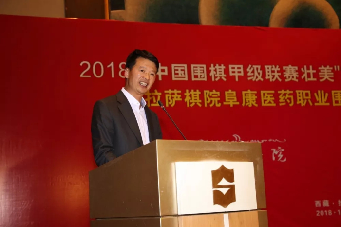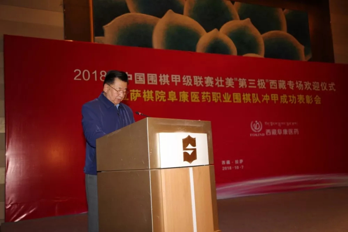 西藏自治區(qū)政府副主席甲熱·洛桑旦增代表自治區(qū)人民政府對各位嘉賓的到來表示熱烈歡迎。他說圍棋是一切棋類運(yùn)動的鼻祖,是中華民族優(yōu)秀傳統(tǒng)文化的瑰寶,融合了軍事、哲學(xué)、詩詞等多種文藝形式,是中華民族幾千年來智慧的結(jié)晶,也是對人類文明的重要貢獻(xiàn)。在建設(shè)社會主義文化強(qiáng)國、體育強(qiáng)國、實現(xiàn)中華民族偉大復(fù)興的中國夢進(jìn)程中,圍棋這樣一項由文化融進(jìn)體育的智慧運(yùn)動承擔(dān)著重要的歷史使命。拉薩棋院西藏阜康醫(yī)藥職業(yè)圍棋隊沖甲成功是西藏體育發(fā)展的重大突破,也是社會力量推動體育事業(yè)發(fā)展的典范。為此我代表自治區(qū)人民政府對西藏阜康醫(yī)藥職業(yè)圍棋隊沖甲成功表示熱烈祝賀,對社會各界支持西藏體育事業(yè)發(fā)展表示感謝,自治區(qū)政府將加快推進(jìn)體育事業(yè)改革、做強(qiáng)做大體育產(chǎn)業(yè),促進(jìn)全區(qū)體育事業(yè)再上臺階。祝愿2018年中國圍棋甲級聯(lián)賽壯美“第三極”西藏專場取得成功,祝愿西藏阜康醫(yī)藥職業(yè)圍棋隊在明年的甲級聯(lián)賽中取得更好成績。