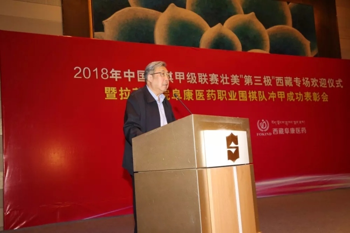 中國圍棋協(xié)會主席林建超將軍在致辭中表示,拉薩棋院西藏阜康醫(yī)藥職業(yè)圍棋隊沖甲成功是全國圍棋運(yùn)動中的一件大事。它首先改變了當(dāng)代中國圍棋運(yùn)動的版圖,雪域高原第一次在中國圍棋甲級聯(lián)賽中占有了一席之地;其次,這次沖甲實現(xiàn)了西藏體育發(fā)展的一次突破,使西藏在全國性的體育賽事中,擁有了第一支甲級職業(yè)隊伍;第三,本次沖甲成功,為圍棋文化和藏式棋類文化的交融促進(jìn)提供了一個很好的契機(jī),為西藏地區(qū)棋文化的發(fā)展起到了很好的推動作用。這項成績來之不易,首先應(yīng)該歸功于自治區(qū)各級黨委、政府的重視,尤其是齊扎拉主席長期以來對包括圍棋、藏式棋等棋類活動的支持,有效促進(jìn)了這項中華民族優(yōu)秀傳統(tǒng)文化在雪域高原的普及與發(fā)展,這是與習(xí)近平總書記在十九大報告中提出的戰(zhàn)略目標(biāo)相一致的。