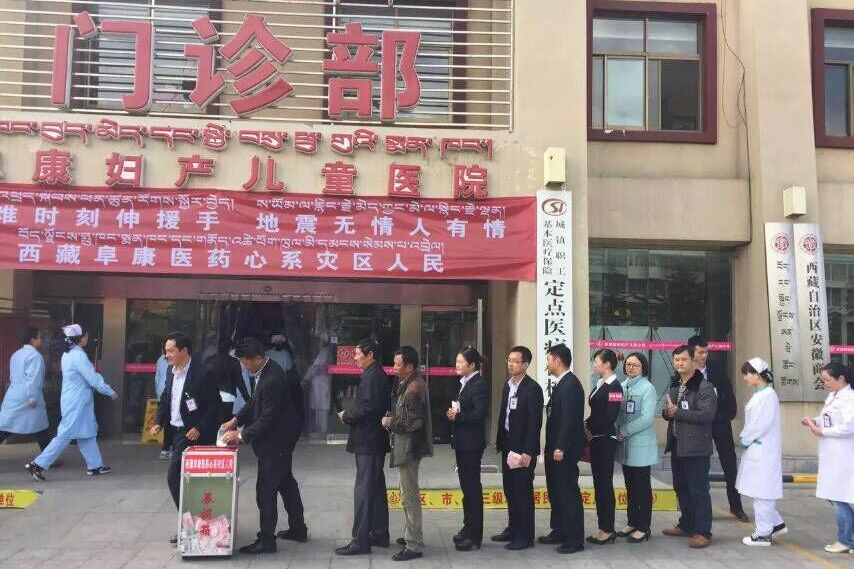在得知尼泊爾地震后第一時(shí)間,阜康醫(yī)藥發(fā)展有限公司攜西藏阜康醫(yī)院、阜康醫(yī)院婦產(chǎn)兒童分院、阜康醫(yī)院心腦血管分院、阜康(國(guó)際)健康體檢中心以及旗下各大藥房舉行了災(zāi)區(qū)捐款儀式。