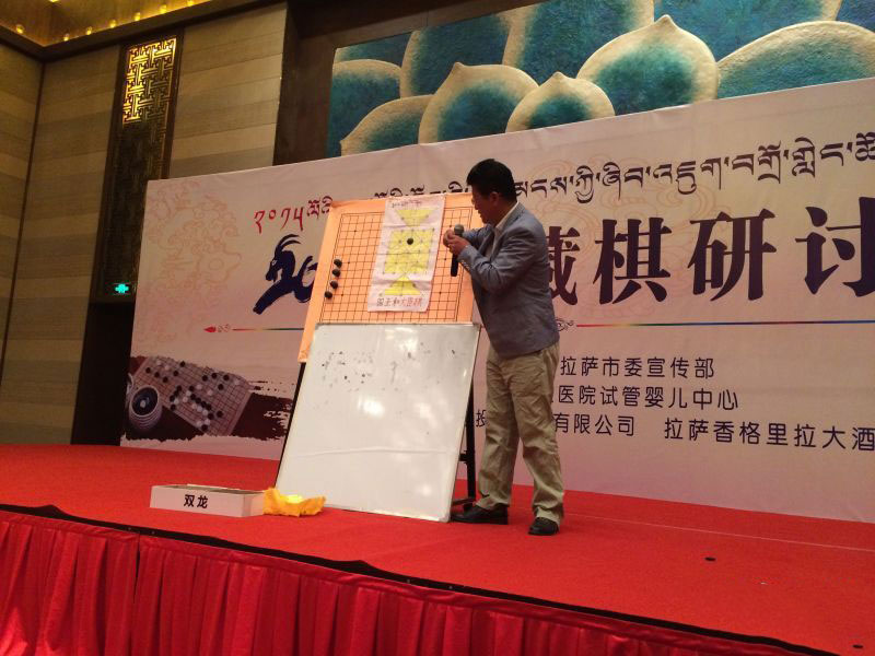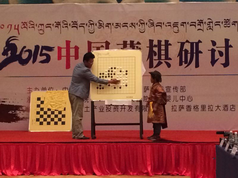 11月7日上午10時(shí)30分,2015中國(guó)藏棋研討會(huì)在香格里拉大酒店1號(hào)宴會(huì)廳開(kāi)幕,阿旺邊巴老師現(xiàn)場(chǎng)講解藏棋歷史沿革、發(fā)展分布概況及藏式圍棋(密芒)、久、國(guó)王與大臣等藏棋介紹。并與現(xiàn)場(chǎng)人員互動(dòng)演繹“國(guó)王與大臣棋”、“魚棋”等。