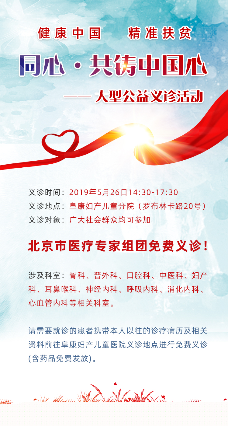經(jīng)西藏自治區(qū)政府的大力支持與協(xié)調,“同心·共鑄中國心”大型公益義診活動于5月26日14:30-17:30在阜康婦產(chǎn)兒童醫(yī)院開展,此活動由中共中央統(tǒng)戰(zhàn)部指導,助力“健康中國”“精準扶貧”國家戰(zhàn)略,促進“邊疆民族”地區(qū)醫(yī)療衛(wèi)生事業(yè)發(fā)展,是以疾病救治為核心進行的大規(guī)模定點、定向主題公益活動。