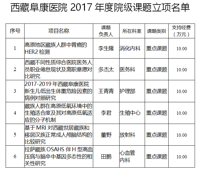 這是我院首次組織申報并批準(zhǔn)立項的院級課題。課題主持人均為我院醫(yī)務(wù)人員。本年度立項資助的6個課題均為院級重點課題,每項課題將提供10萬元的研究經(jīng)費。課題自2017年10月1日正式實施,期限為兩年。