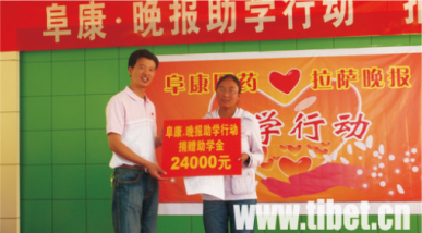 2008年8月29日下午,“阜康獎(jiǎng)學(xué)金.晚報(bào)助學(xué)行動(dòng)”活動(dòng)組委會(huì)在西藏阜康醫(yī)院會(huì)議室舉行捐助儀式,西藏16名品學(xué)兼優(yōu)的貧困學(xué)生獲得了每人每年6000元的捐助,解決了他們大學(xué)四年的生活費(fèi),至此,為期兩個(gè)多月的“阜康·晚報(bào)助學(xué)行動(dòng)”愛(ài)心捐助活動(dòng)畫(huà)上了圓滿(mǎn)的句號(hào)。