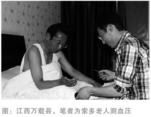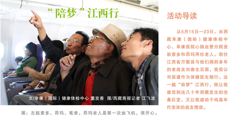 我們5月15日從拉薩出發(fā),一路向東,到成都轉(zhuǎn)機(jī),兩天的時(shí)間,已經(jīng)跨越了2400多公里。16日,載著夢(mèng)想的飛機(jī)抵達(dá)了江西南昌機(jī)場(chǎng),劉春生老人的大兒子在機(jī)場(chǎng)熱情地迎接我們,將我們接到老人的故鄉(xiāng)萬(wàn)載縣。我們決定在縣城賓館休息一天后再啟程前往劉春生老人的家,于是我為同行的兩位老人做了全面的檢查,索多老人的血糖在7.0mmol/L左右,令我擔(dān)心的是昂瑪老人血壓本來就偏高而且又是第一次去內(nèi)地,他的血壓波動(dòng)在140-150/90-100mmHg,比較平穩(wěn),我叮囑老人見面時(shí)注意控制情緒,不要過于激動(dòng)。