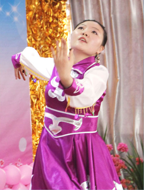 丹丹告訴筆者,之所以會(huì)選擇“鴻雁”這支舞蹈,是因?yàn)橄矚g上了“鴻雁”那首歌,歌聲悠揚(yáng)婉轉(zhuǎn),仿佛把她帶到了大草原,看到了美麗的牧羊姑娘,看到了悠閑的馬兒,看到了像白蓮花般盛開(kāi)的氈包……因?yàn)檎也坏胶线m的舞伴,丹丹只好把這支集體舞改成了獨(dú)舞,練習(xí)中她不是純粹的模仿,也會(huì)適當(dāng)?shù)馗木?。練?xí)鴻雁時(shí)自己傷佛也變成了一只北歸的大雁,那是一種很奇妙的感覺(jué)。能夠在此次演出中獲得大家的認(rèn)可更是堅(jiān)定了她練習(xí)舞蹈的決心,丹丹表示會(huì)繼續(xù)練習(xí)舞蹈,爭(zhēng)取在下一次的演出中帶給大家更美的視覺(jué)盛宴。