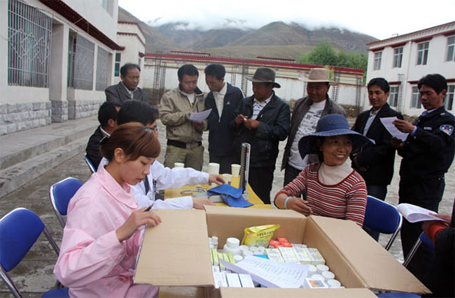通過(guò)為尼木縣鄉(xiāng)村小學(xué)老師們的體檢,董發(fā)善醫(yī)生說(shuō):“大部分老師都患有血管神經(jīng)性頭疼和不同程度的胃病和膽囊疾病。這是由于在鄉(xiāng)村學(xué)校中,老師們工作繁忙,經(jīng)常忘記吃飯或者到了吃飯的時(shí)候就湊合吃幾片風(fēng)干肉,喝幾杯酥油茶。這是造成鄉(xiāng)村老師腸胃和膽囊疾病的主要原因。此外,由于老師們經(jīng)常站著講課,腰椎疾病的患病率比其他行業(yè)的要高。”在體檢的同時(shí),醫(yī)護(hù)人員還向老師們發(fā)放了常見(jiàn)疾病預(yù)防知識(shí)的宣傳材料。