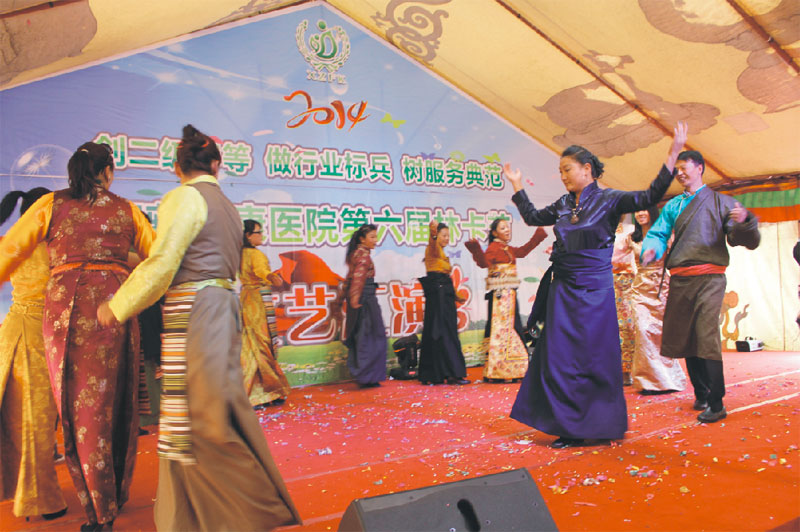 “阜康人的友情因相聚而濃烈,阜康人的夢想因分享而永恒,阜康人的執(zhí)著因勇氣而堅(jiān)定,阜康人的感恩因摯愛而無限……”在主持人聲情并茂的報(bào)幕中,西藏阜康第六屆林卡文藝活動(dòng)拉開了帷幕。西藏阜康醫(yī)藥有限公司王斌董事長致辭,表達(dá)了對林卡活動(dòng)這一企業(yè)文化的支持,并預(yù)?;顒?dòng)取得圓滿成功。文藝活動(dòng)的現(xiàn)場,精彩紛呈,高潮迭起,有充滿了民族風(fēng)情的藏舞《酥油飄香》,有逗趣的民間曲藝《三句半》,有行云流水的古典舞蹈《青花瓷》,有英姿颯爽的跆搏操《Fighting》,有引人深思醫(yī)患小品《如此勸架》,有發(fā)自肺腑的演講《我心中的阜康》。還有一個(gè)特別節(jié)目,是我們西藏阜康醫(yī)院外一科的患者朋友曲英次仁自創(chuàng)自彈自唱的《致阜康醫(yī)生》,他尚未完全康復(fù),拄著雙拐上臺(tái)為我們帶來精彩的演出,這樣和諧的醫(yī)患關(guān)系也是我們今后努力的目標(biāo)。在文藝演出的間隙,還有穿插的小游戲,大家積極踴躍參與,臺(tái)上臺(tái)下其樂融融,賓主盡歡。林卡活動(dòng)一共進(jìn)行了兩天,中午的文藝活動(dòng)后是自助餐時(shí)間,下午則是員工們交流感情,自由活動(dòng)的時(shí)間。