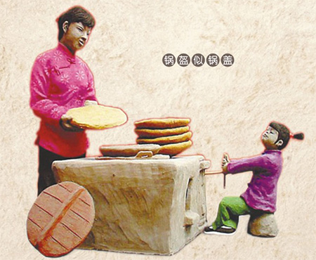 鍋盔在陜西可是隨處可見。它可是面食中的又一經(jīng)典。相傳唐代修乾陵時(shí),因服役的軍人工匠人數(shù)過(guò)多,往往為吃飯而耽誤施工進(jìn)度,受到懲罰。于是,有一士兵在焦急之中便把面團(tuán)放進(jìn)頭盔里,把頭盔放到火中去烤而烙成餅,這便有了鍋盔一說(shuō)。