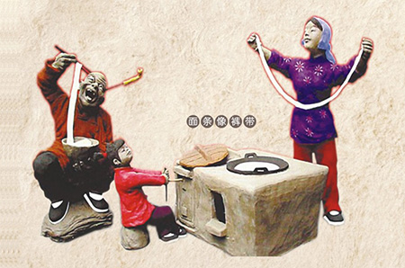 關(guān)中獨(dú)特的地理構(gòu)造和自然環(huán)境使得關(guān)中地區(qū)成為一個(gè)以面食為主的地區(qū),在以米菜為主的地方的人們總是想不通,那陜西人天天吃面條沒個(gè)花樣換,怎么就吃不煩呢? 其實(shí),在陜西,聰明靈巧的陜西婆娘們已經(jīng)把面食發(fā)展到一個(gè)很高的境界了。單是一個(gè)簡(jiǎn)單的面條,關(guān)中人做出的花樣達(dá)幾十種,棍棍面、片片面、涼面、臊子面、酸湯面、漿水面等等。