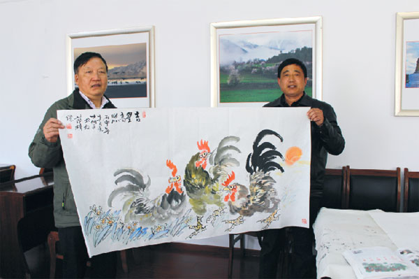 3月28日受自治區(qū)文聯(lián)黨組書記兼副主席沈開運邀請陳明文先生在自治區(qū)文聯(lián)會議室作文化交流。交流會上陳明文先生展示了自己的近期作品,沈開運主席代表自治區(qū)文聯(lián)收錄了其畫作《吉星高照》。