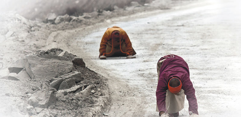 這是快樂美好的七個月,這七個月我們度過了拉薩舒適的夏季、絢麗的秋天、干燥而陽光燦爛的冬季,領(lǐng)略了雪域高原的大美風(fēng)光和藏區(qū)神圣的宗教人文景觀。五彩的經(jīng)幡在湛藍(lán)的天空下飄揚、清澈見底的高山湖泊在明媚的陽光下泛著七彩的波光,高聳入云的雪山讓人仰望;喇嘛紅衣、匍匐在朝圣路上的信徒,在西藏這片熱土上屹立著堅定的信仰。我不懂他們,我只是靜靜看著他們,在目光相遇的時候,給一個微笑,我便得到了發(fā)自心底的快樂、滿足和信任。在他們面前,一切都變得簡單、虔誠、付出也是一種快樂。認(rèn)識了車隊的巴次,知道了巴次的一些故事,留心著他的言行,我知道了一個普普通通的藏族青年,有著佛一樣的慈悲心,他就那樣付出著、快樂著……我被感動著,感染著。