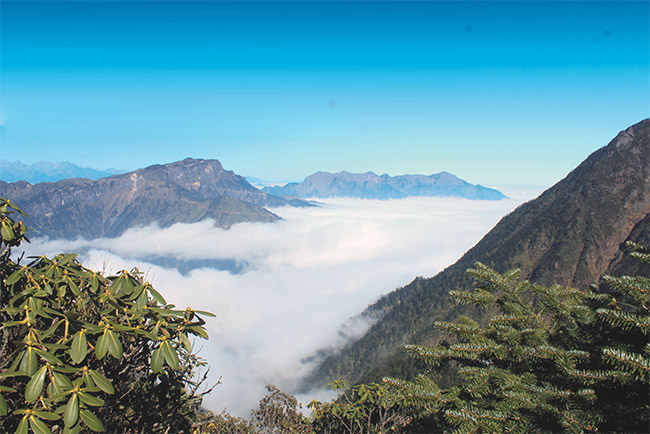 牛背山最令人著迷的便是云海,牛背山的云海,濃密而均勻,壯闊而平緩,隨處可見的瀑布云猶如阿凡達(dá)中“哈利路亞山”一般讓人感覺(jué)踏步于空中;而環(huán)顧四周連綿不斷的群山錯(cuò)落有致,層次分明,蜀山之王貢嘎雪山矗立于最高點(diǎn),泥巴山、娘娘山、瓦屋山、峨眉山、夾金山、四姑娘山和二郎山在前,大渡河大峽谷在后,幾乎天府之國(guó)的所有名山峻嶺在此時(shí)都變成了玲瓏盆景,而翻滾的云霧之下,群山丘陵逐級(jí)降低,緩緩融入稻浪翻滾的天府平原。