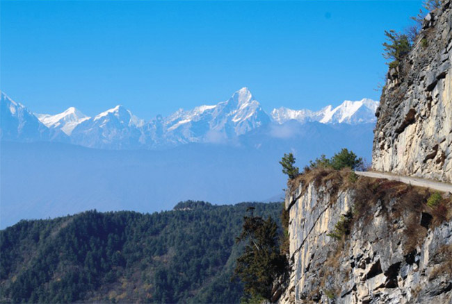 前幾天山里一直在下雨,因此道路濕滑,并不好走,我們拄著登山杖,走得很小心,卻仍然免不了摔跤。最初天空陰沉沉的,山間的霧濃得化不開,大家心里免不了有點(diǎn)沮喪,難道這次我們也要帶著遺憾離開嗎?慢慢地,太陽(yáng)從云層間透出一點(diǎn)點(diǎn)光芒,雖然微弱,卻帶給我們莫大的希望??伤駛€(gè)調(diào)皮的孩子一樣,給你扮個(gè)鬼臉后,一會(huì)兒又消失不見了。心情再次低落起來(lái),埋著頭一個(gè)勁兒往上沖,期望著到了山頂就能是好天氣。誰(shuí)知這幸運(yùn)來(lái)的如此之快,走到一半時(shí),山里的霧開始逐漸散開,遠(yuǎn)處的雪山一點(diǎn)點(diǎn)顯現(xiàn)出來(lái),就像那害羞的姑娘,在千呼萬(wàn)喚下終于揭開它那神秘的面紗,雪山連綿不斷,一座接著一座,最引人注目的便是貢嘎群山,它們似乎觸手可及,卻又隔著濤濤云海。我們的激動(dòng)無(wú)以言表,原本已疲憊的身體立刻變得精神抖擻,因?yàn)榍胺竭€有更美的風(fēng)景等著我們。