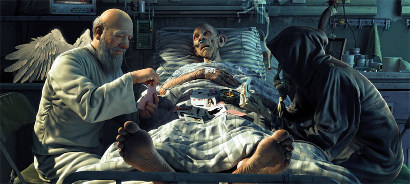 一個將死之人,在彌留之際,發(fā)現(xiàn)身邊坐著兩個人,魔鬼和天使。他們在床邊玩牌,并以牌局論輸贏,賭這個人的靈魂是飛到天堂,還是下到地獄。他緊張地看著牌局,不知道自己的命運(yùn)會怎樣。