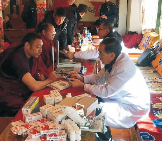 12月10日,在西藏阜康醫(yī)院名譽院長、慢病管理中心主任張德才的帶領(lǐng)下一行6人前往楚布寺,義診中張院長和田豐輝醫(yī)生負責(zé)測血壓,唐宗青測血糖,瓊瑪負責(zé)發(fā)放藥品,占堆對每一位血壓、血糖高的僧人、群眾進行登記,張院長根據(jù)西藏人民的生活健康狀況,對來義診人員提出《健康五大基石》。