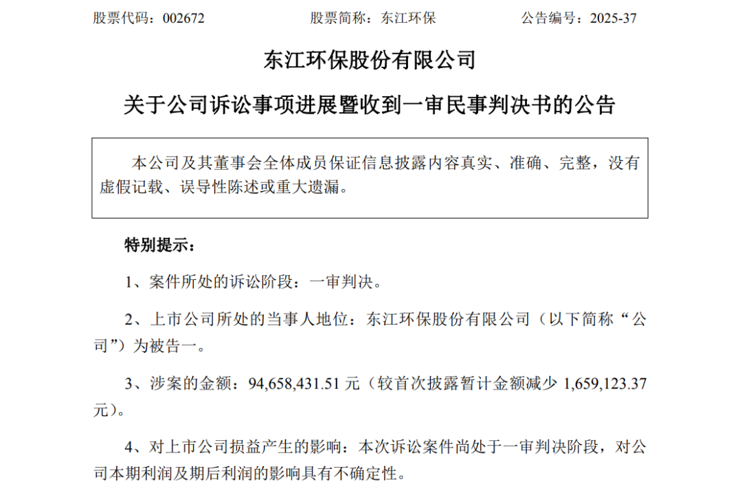 在東江環(huán)保于2024年8月21日發(fā)布的公告中,詳細(xì)說明了此次案件的始末: